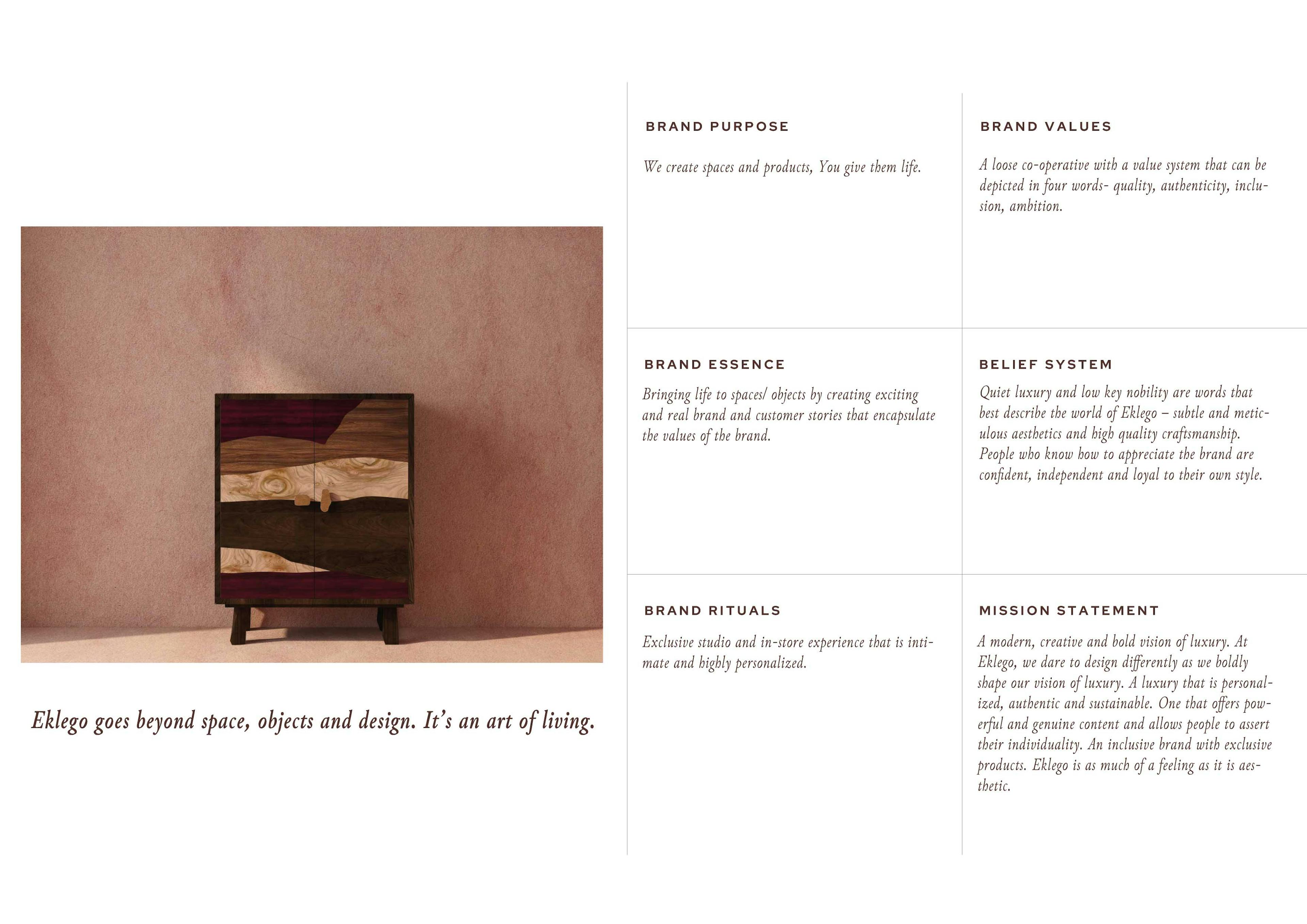 Eklego is an award-winning architecture, interior, and furniture design studio based in Cairo. Rooted in the Greek word eklego (ἐκλέγω), meaning "to choose," the brand’s philosophy revolves around thoughtful selection—of ideas, materials, and experiences. We led a comprehensive rebranding effort to evolve Eklego from a design studio into a lifestyle brand. The strategy focused on deepening audience connection, elevating brand salience, and positioning Eklego as a curator of lived experience. The new visual identity builds on the brand's name and ethos—exploring dualities such as designer vs. user, space vs. time, and identity vs. ideology. The logomark symbolizes this dialogue, with two mirrored forms representing the ongoing exchange between the brand and its audience. The color palette highlights Eklego’s two pillars: People and Time. The refreshed identity tells a story of evolution—design that moves with life and reflects it. It translates across all brand touchpoints, from the showroom to digital platforms, creating a cohesive, immersive experience that captures Eklego’s essence: spaces that invite memory, dialogue, and belonging.